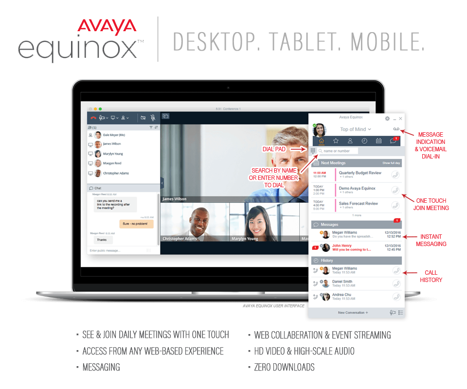 With Avaya's Equinox Conferencing system you can consolidate to a single meeting platform to simplify any task. Bask in the benefits of face-to-face interactions with clients and colleagues from any device. With just one click you can connect from anywhere in the world. Easily share content, comments, record sessions, experience high quality audio, and so much more.